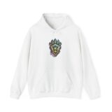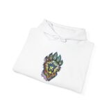 This cozy hooded sweatshirt carries a bold, nature-inspired emblem at the chest — a stylized wolf face nested inside a paw silhouette, rendered in jewel-tone greens, blues and warm accents. The medium-heavy 50/50 cotton-poly blend feels soft and weighty without being bulky, so it settles like a warm layer on cool mornings. The double-lined hood and color-matched drawcord give the piece a clean, finished look, while the kangaroo pocket keeps hands warm and adds casual functionality. Wear it on forest walks, late-night campfire runs, or quiet mornings with coffee; the graphic reads like a personal totem for someone who values wilderness, quiet strength, and a touch of hand-drawn artistry in everyday wear.